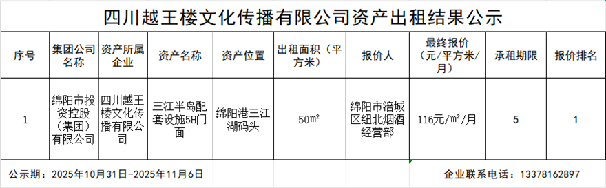 四川越王樓文化傳播有限公司資產(chǎn)出租結(jié)果公示