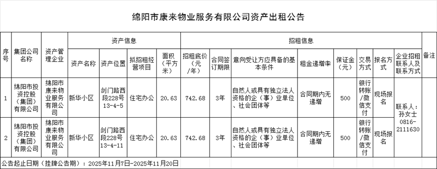 綿陽市康來物業(yè)服務(wù)有限公司資產(chǎn)出租公告