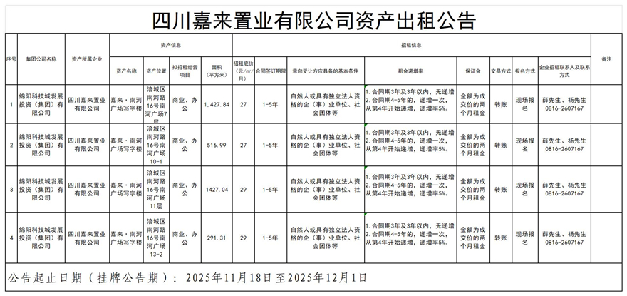 四川嘉來(lái)置業(yè)有限公司資產(chǎn)出租公告