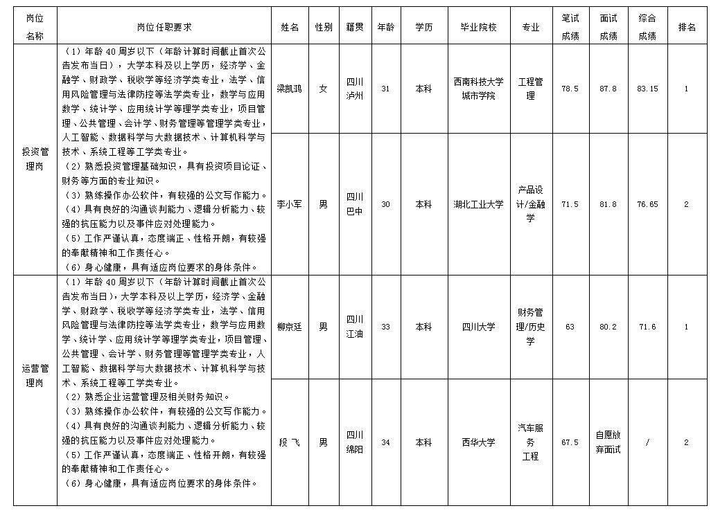 根據(jù)綿陽市投資控股(集團(tuán))有限公司發(fā)布的招聘公告及招聘相關(guān)規(guī)定,經(jīng)筆試、面試等程序,現(xiàn)將筆試(面試)成績(jī)予以公示。