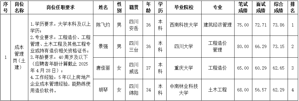 根據(jù)綿陽市綿投置地有限公司發(fā)布的招聘公告及招聘相關(guān)規(guī)定,經(jīng)筆試、面試等程序,現(xiàn)將筆試、面試成績予以公示。