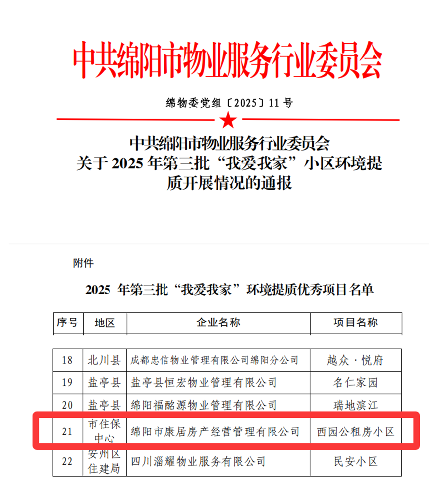 近日,綿陽市物業(yè)服務(wù)行業(yè)協(xié)會(huì)通報(bào)表揚(yáng)2025年第三批“我愛我家”小區(qū)環(huán)境提質(zhì)優(yōu)秀項(xiàng)目,西園公租房小區(qū)榜上有名。成績的取得,是對康居公司踐行“三心”服務(wù),即:以住戶為核心、與住戶貼心、讓住戶放心的有力佐證。